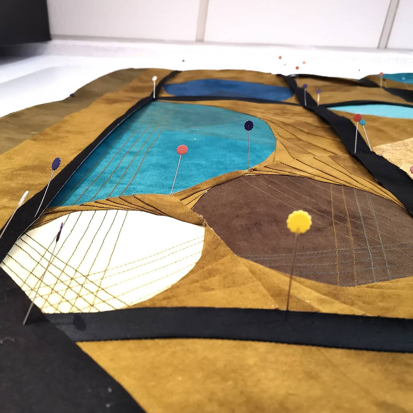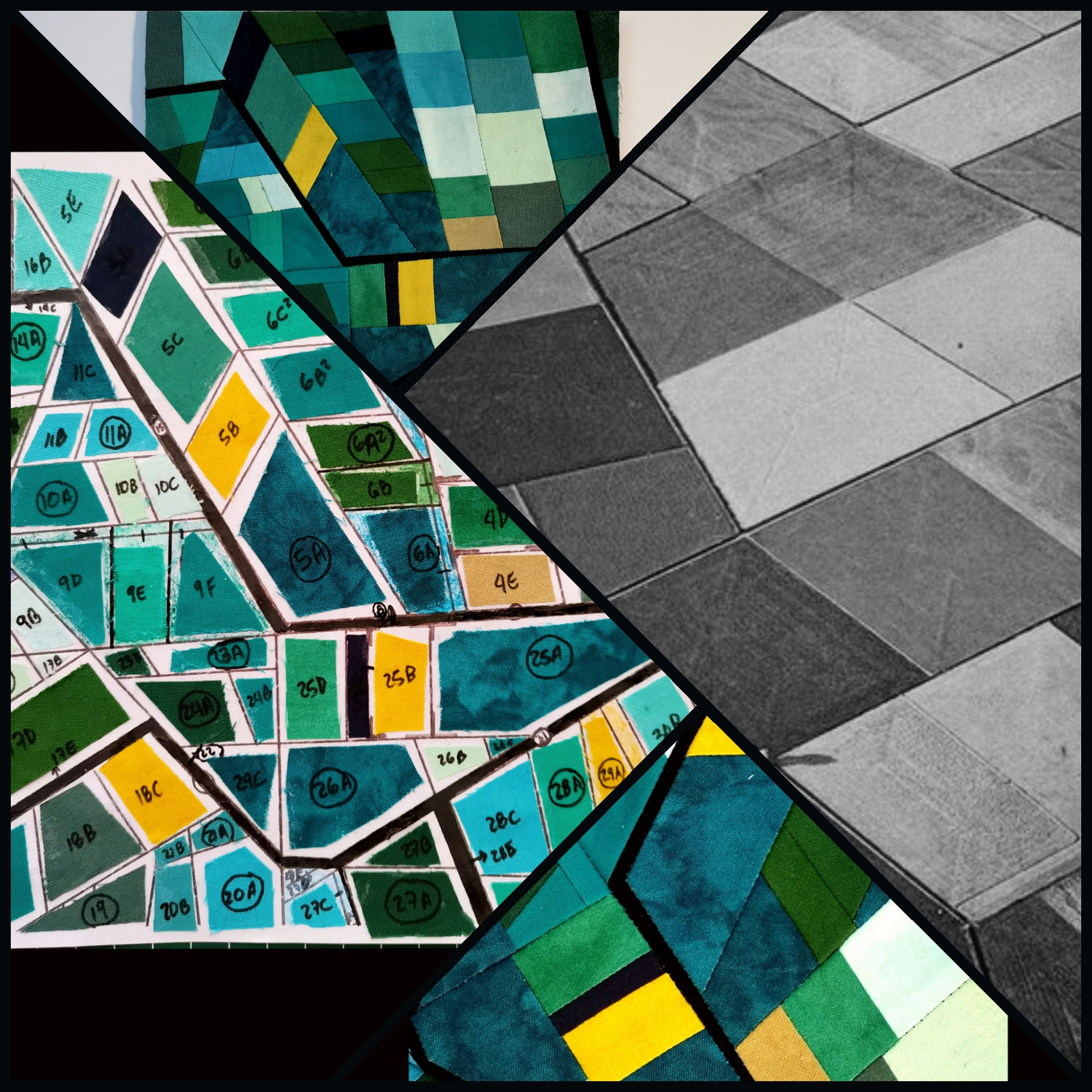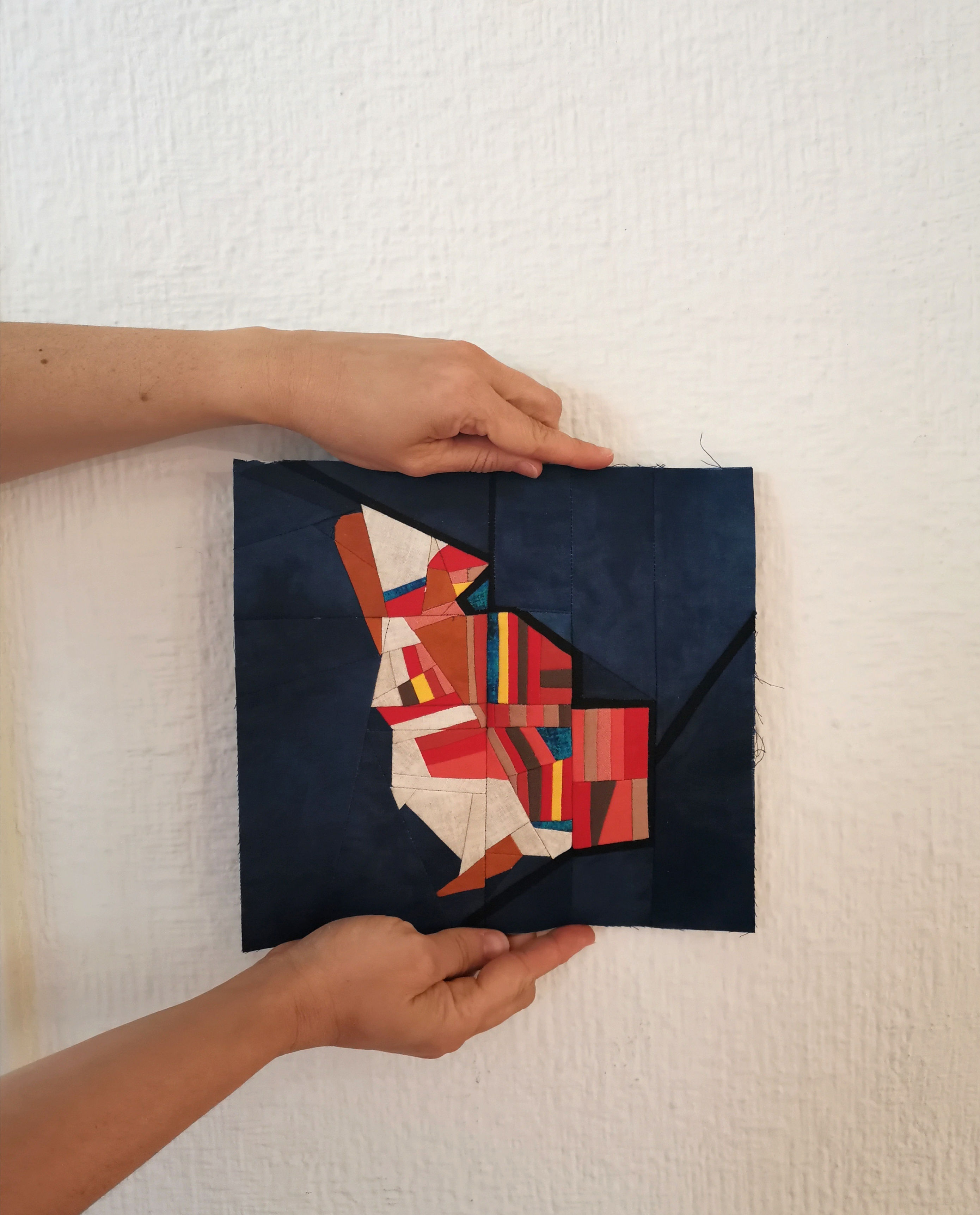 El patchwork es un Arte milenario donde predomina el trabajo riguroso con los textiles, es una labor muy exquisita de detalle y de mucha paciencia. Yo no suelo ser perfeccionista y tampoco paciente, sin embargo, cuando realizo estos trabajos se rompen todos los esquemas. En el caso del método Foundation Paper Piecing fué todo un suceso cuando lo encontré, sucedió por casualidad un día viendo imágenes de obras en un festival de quilt que se realiza anualmente en Birmingham Inglaterra, la manera en la que estaban cosidas aquella piezas eran de un nivel de precisión, de perfección y de complejidad que no podía descifrar, lo cual captó toda mi atención y no paré hasta lograr entender durante par de meses después la intrincada madeja que hay detrás de los patrones que acompañan este tipo de obras. Mi inglés no es bueno, pero eso no fué un impedimento para ir traduciendo poco a poco el único libro que hallé y que me orientó para hacer mis propios dibujos en base a esta técnica hasta convertirlos luego en esos mapas de los que hemos estado hablando. Fue toda una odisea, pero ahora mismo esto me da una confianza enorme en los próximos trabajos que quiero hacer y me hace sentir súper feliz.