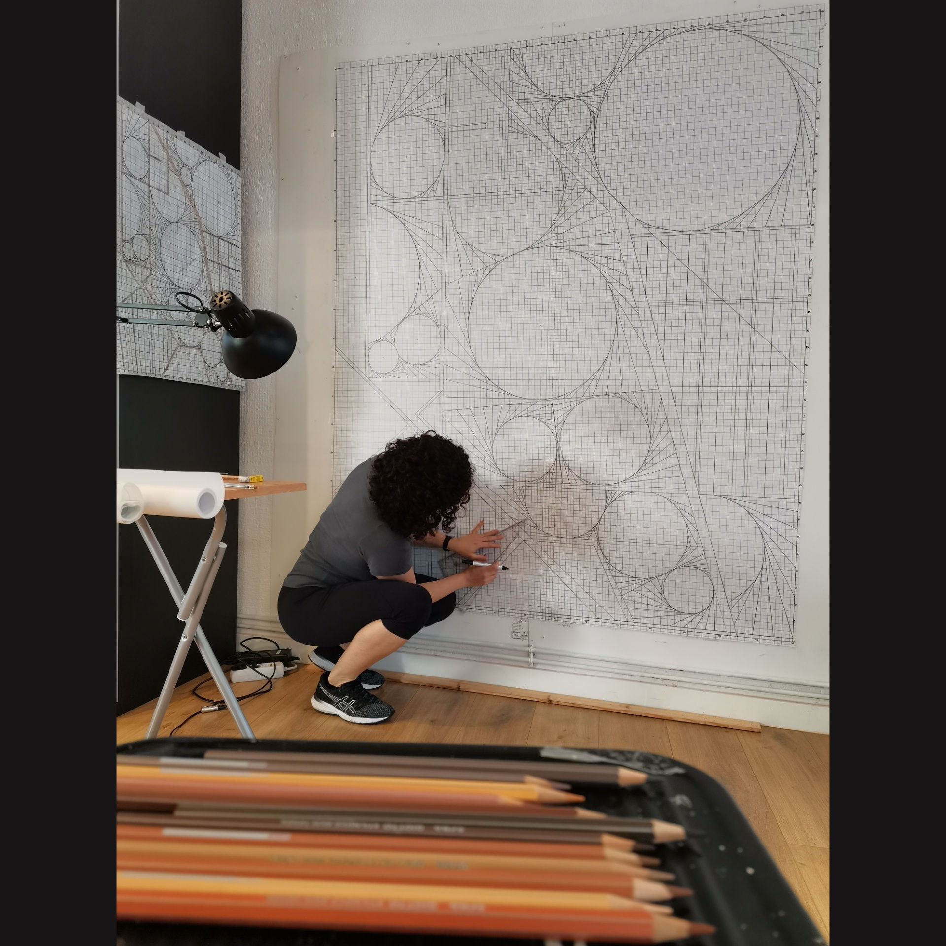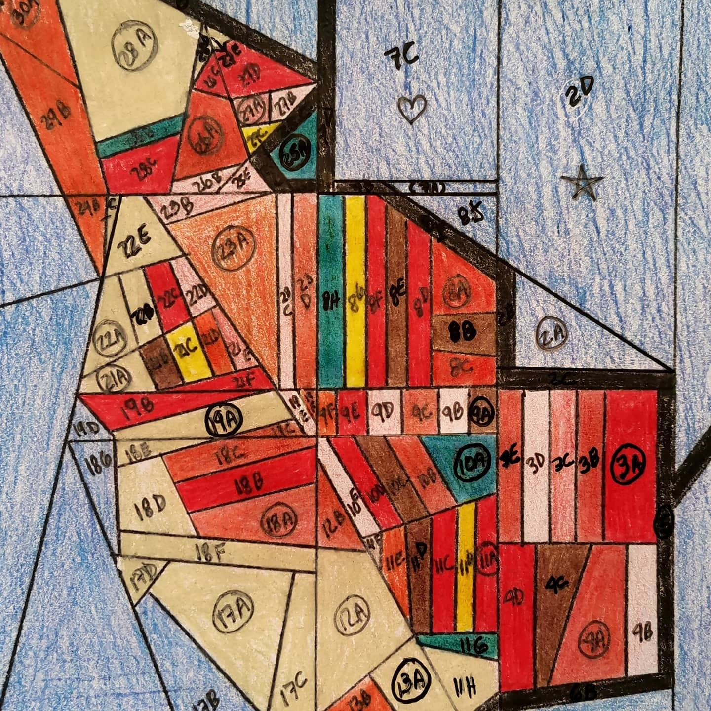 Depende, hay dibujos que sí son los bocetos, yo diría más, son una parte inevitable de la obra, esos que luego se llenan de números y más adelante de retazos de tela o bien fragmentos coloreados, como son los que utilizo para los mapas en la serie Jardines de la inconsciencia, ellos son parte del proceso previo, la guía que me permite poder llevar las piezas a la máquina de coser que es el último paso. Pero si te refieres a los dibujos pequeños de la Serie Primavera del 2020, son inspirados en las deconstrucciones de los patrones de las mascarillas. Y cada uno funciona como obra independiente.